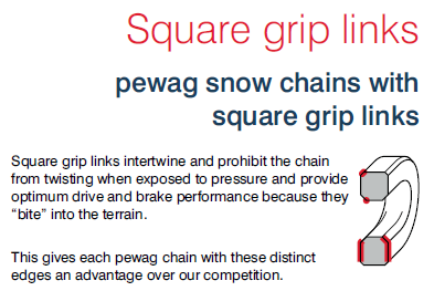 With their square links and diagonal pattern, these easy-to-install, self-tensioning, alloy steel chains offer superior traction and a smooth ride. Specially designed for vehicles with limited wheel well clearance.